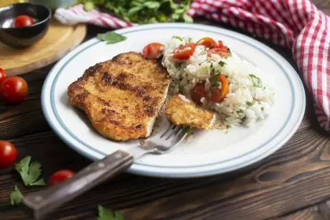Шаг 4: Мелко нарезать чеснок и петрушку, разрезать помидоры черри пополам. Добавить к рису сливочное масло, чеснок, петрушку и кардамон, перемешать. На тарелке выложить рис и шницель, подавать горячими.