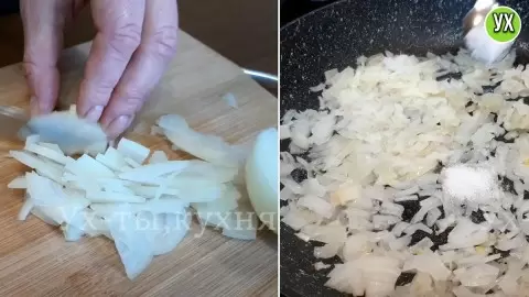 Начинают с лука. На сковороду с растительным маслом помещают нарезанный кубиками лук и добавляют немного соли и сахар. Сахар поможет луку карамелизироваться, а соль усилит его вкус. Лук обжаривают до золотистой корочки, пока он не станет мягким и слегка «распушённым».
