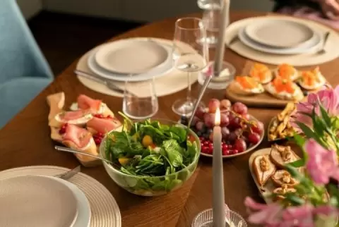 Также следует помнить о том, что салаты на сметане или йогурте, а также различные паштеты и нарезки должны оставаться на столе не более двух часов. Иначе они становятся небезопасными для здоровья. Упрощенные рецепты с 3-4 проверенными компонентами — это лучший выбор. Лучше заправить салаты сразу перед подачей и убрать все остатки в холодильник.