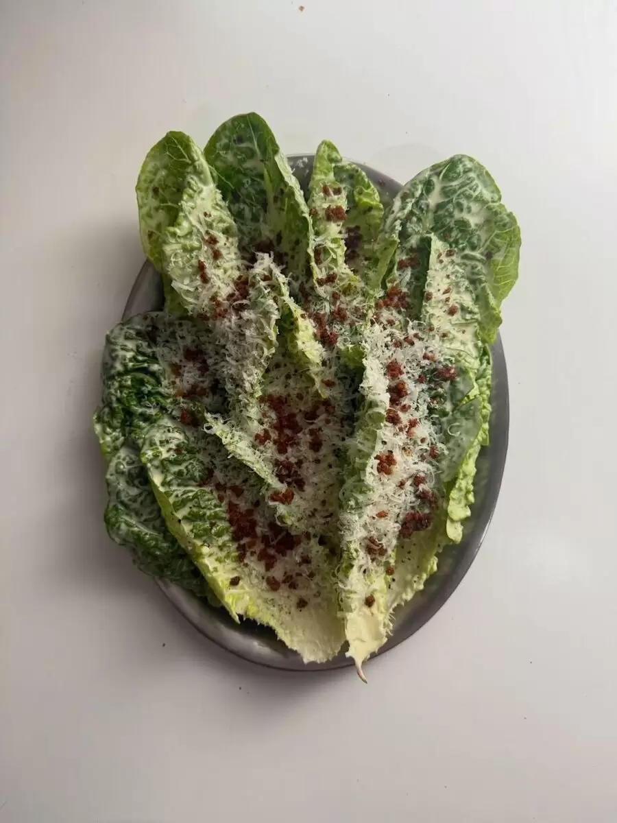Чувство свежести начинает обещанием простого салата, который держится на идее баланса между кисло-солёным и хрустящей текстурой. В чаше собираются светло-лимонный аромат и нежная кремовая заправка, стабилизируемая яйцом и пармезаном, а сверху отлично ложатся поджаренные сухари.
