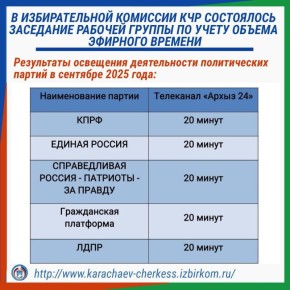 Рабочая группа Избирательной комиссии КЧР в ходе заседания рассмотрела сведения по учету эфирного времени, затраченного Телеканалом «Архыз 24» на освещение деятельности пяти парламентских партий Карачаево-Черкесии в сентябре 2025...